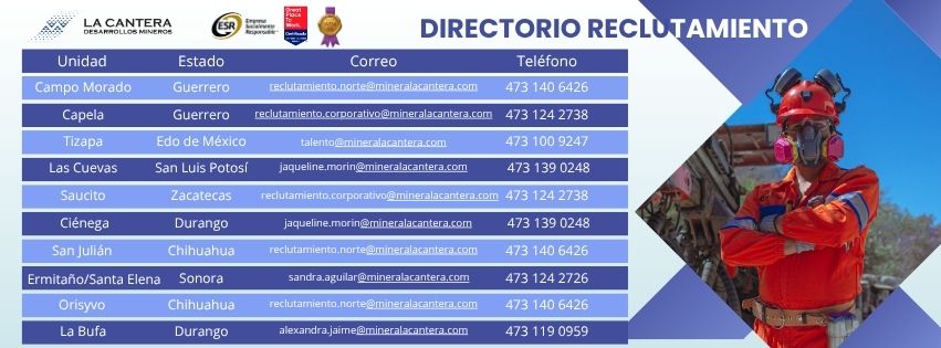 ÁREA DE OPORTUNIDAD DE TU INTERÉSASISTENTE DE RESIDENTEAUXILIAR ALMACÉNAUXILIAR TOPOGRAFÍAAYTE. ELÉCTRICOAYTE. GENERALAYTE. JUMBO ANCLADORAYTE. JUMBO LINEALAYTE. MECÁNICOAYTE. VOLADURASBOMBEROCHÓFER ALPHACHOFER CAMIÓNCHÓFER DE SERVICIOSCHÓFER EXPLOSIVOS (POLVORERO)CHÓFER TROMPOCOCINACOORDINADOR DE PLANEACIÓNCOORDINADOR DE SEGURIDADELÉCTRICOENCARGADO ALMACÉNJEFE DE PLANEACIÓNJEFE MANTENIMIENTOLAMPISTEROLAVANDERÍALIMPIEZALLANTEROMECÁNICA DE ROCASMECÁNICO DE CAMIONESOFICIAL DE SERVICIOSOFICIAL DE VOLADURASOPERADOR AMACIZADOROPERADOR ANCLADOROPERADOR BAJO PERFILOPERADOR BOMBEOOPERADOR DE CAMIÓNOPERADOR DE CAMIÓN VOLTEOOPERADOR ESCALEROPERADOR JUMBO ANCLADOROPERADOR JUMBO LINEALOPERADOR RETROEXCAVADORAOPERADOR SCOOPTRAMOPERADOR TRACTORPARAMÉDICOPISCÓLOGOPRODUCCIÓNPROGRAMADOR MANTENIMIENTORESIDENTESOLDADORSUPERVISOR DE CAMIONESSUPERVISOR DE MANTENIMIENTOSUPERVISOR DE MINASUPERVISOR MECÁNICOSUPERVISOR SEGURIDADTOPÓGRAFOVIGILANTE